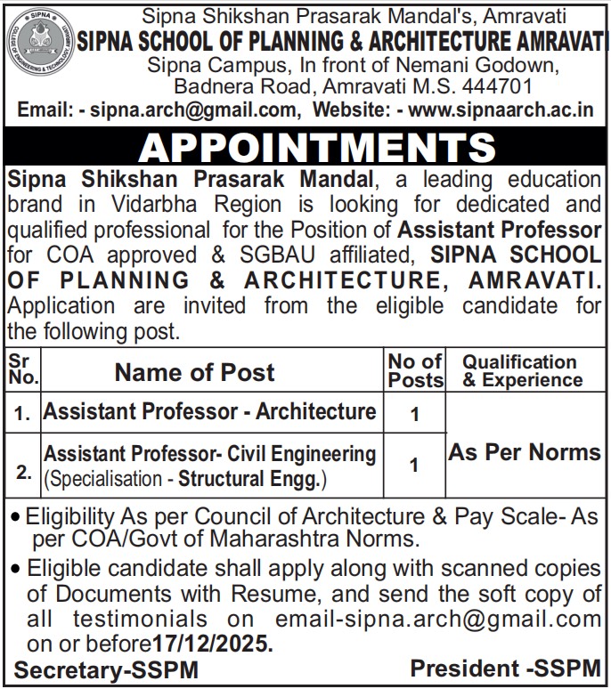 Sipna Shikshan Prasarak Mandal, a leading education brand in vidarbha region is looking for dedicated and qualified professional for the position of Assistant Professor for COA prroved and SGBAU affiliated, Sipna School of Planning and Achitecture, Amravati.